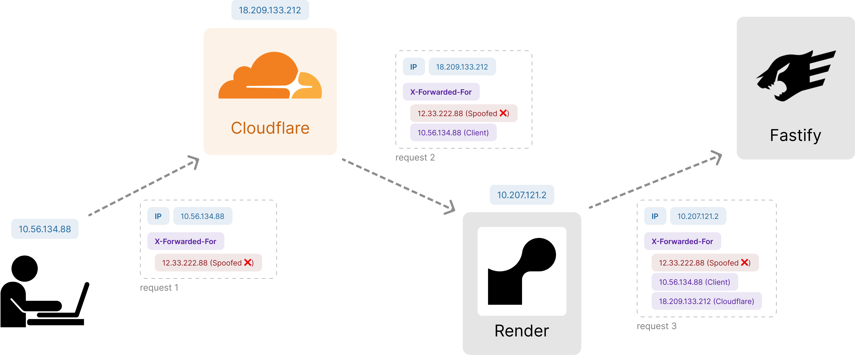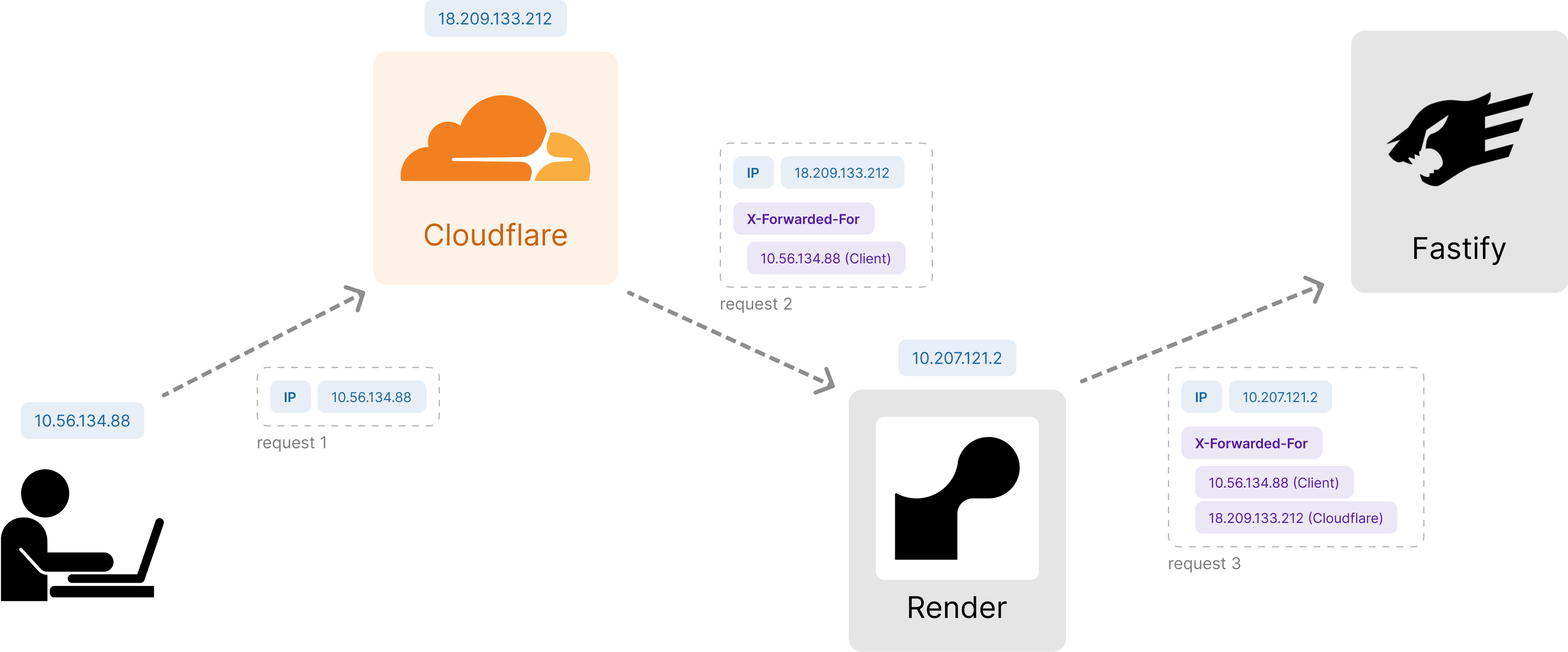 - Idealmente debemos tener la lista de IPs disponibles por cada reverse proxy que conozcamos en nuestro sistema (en este ejemplo vendrían siendo Cloudflare y Render).