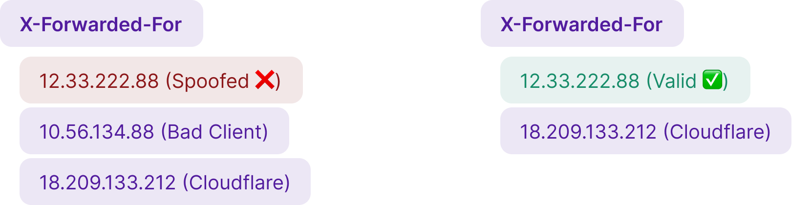 Es importante validar que la fuente de origen sean los proxies esperados, puesto que un atacante también puede intentar alterar el request mandado el mismo header múltiples veces, esperando que alguno de los servicios o nuestro propio código se confundan y llegue inalterado a la validación final: